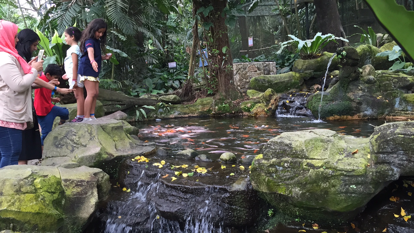 We kickstarted our day with a visit to the KL bird park. I have had lots of families raving abut the bird park and couldn’t wait to see what the attraction was like. The bird park is the worlds largest free frying aviary and it looked fabulous. The entrance for the park isn’t the cheapest at £10 per adult and £8 per child (based on prices in Malaysia). I was expecting to see hundreds of birds flying around and will admit that I was slightly disappointed with the numbers of birds we came across, but it could be the time of day or maybe my expectation. However, the park came truly onto its own in the feeding. Maya was able to feed a Hornbill bird and I think that the feeding sessions were a great idea. Unlike zoos in the UK these feeding sessions allow the visitors to get hands on.